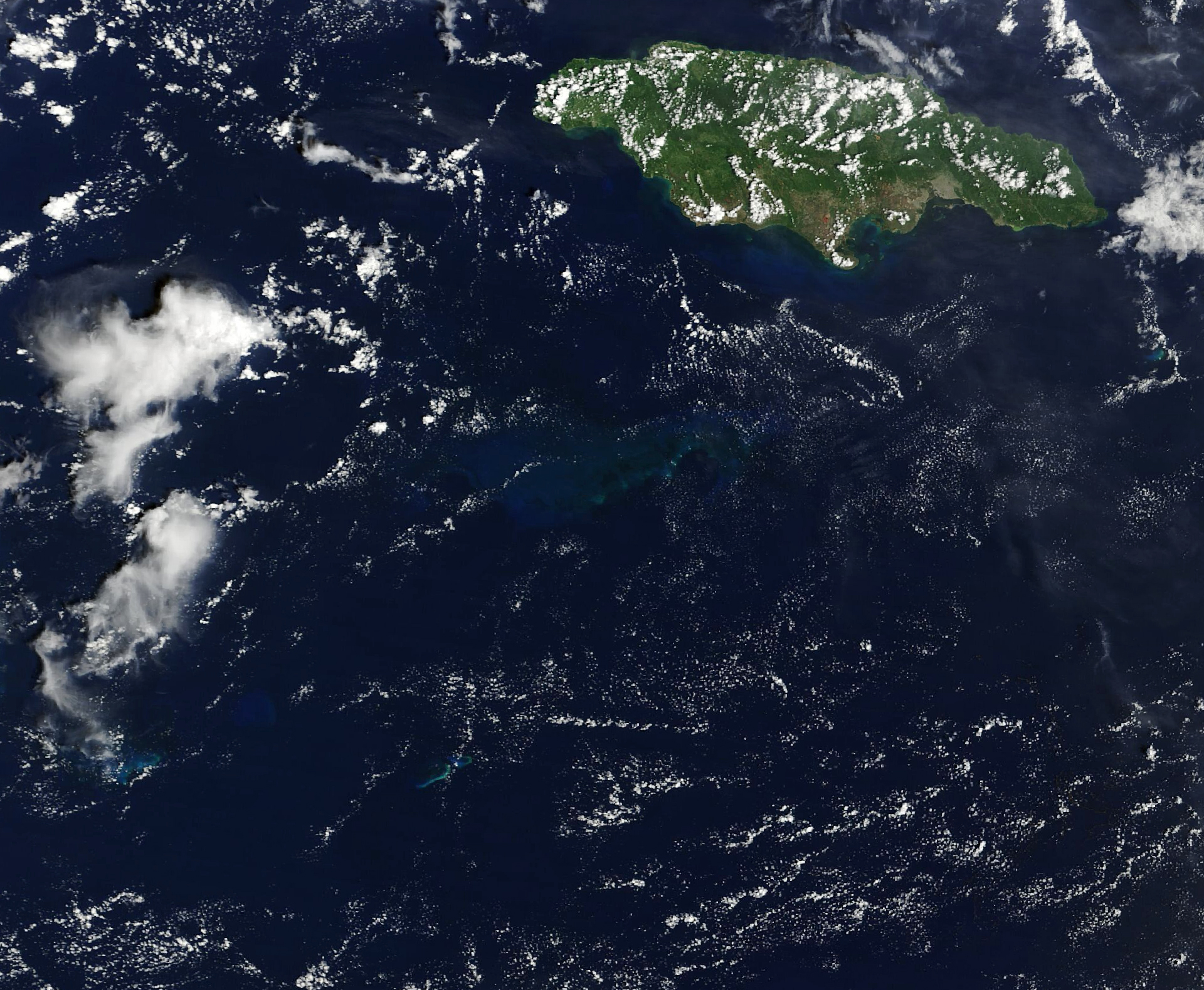 Pedro Bank is deep enough that it is only faintly visible in natural color satellite images most of the time. However, with enough disruption from hurricanes or strong cold fronts, its existence becomes more evident to satellites. Suspended calcium carbonate (CaCO3) mud, consisting primarily of remnants of marine organisms that live on the plateau, turns the water a Maya blue color. The appearance of this type of material contrasts with the greenish-brown color of sediment carried out to sea by swollen rivers on Jamaica’s southern coast.