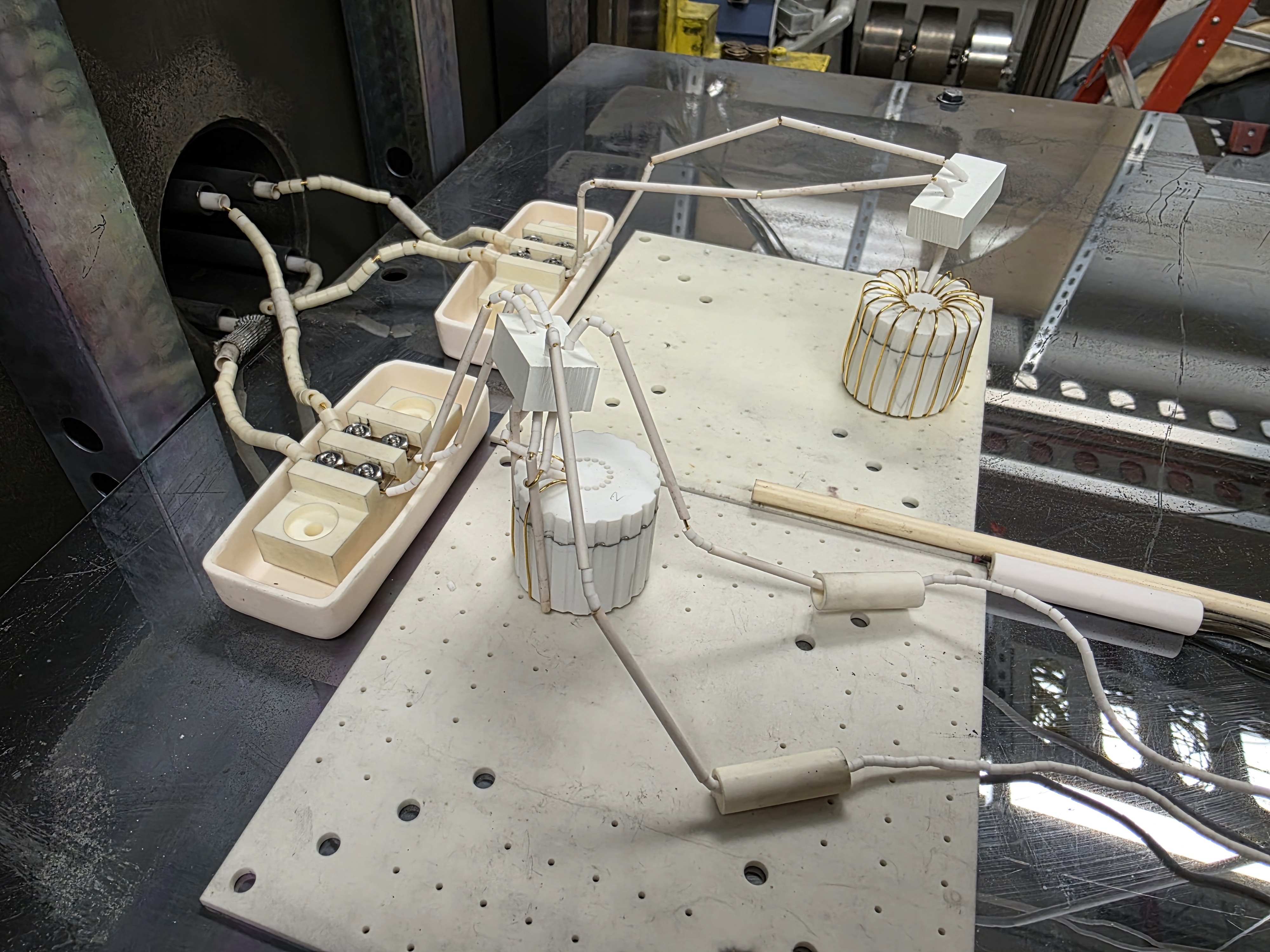 Two packaged inductors with electrical windings sit on a large plate with wiring attached to the inductors and to the Glenn Extreme Environments Rig.